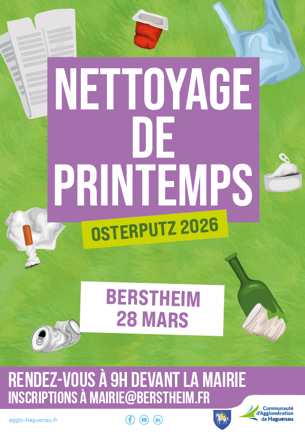 La 29ème édition du Nettoyage de Printemps se déroulera le samedi 28 mars 2026, rendez-vous à 9h devant la mairie de Berstheim.